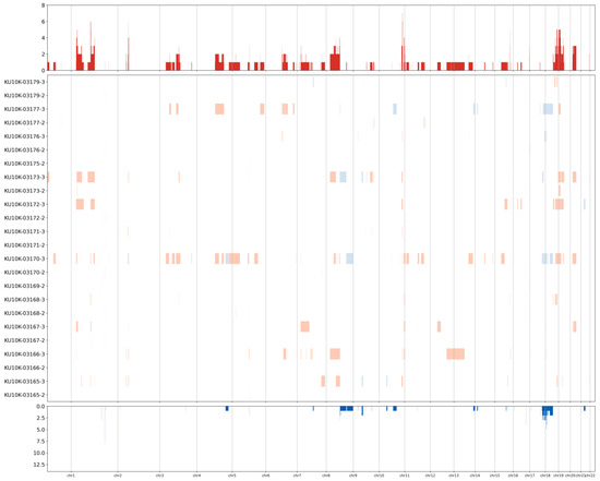 Heatmap showing the copy number variation levels. Rows represent samples and columns represent chromosomal locations. Red, amplification; blue, deletion.