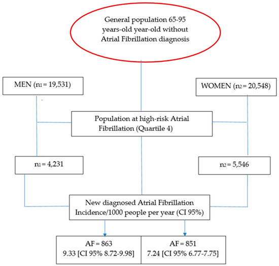 Although several AF prediction scores have been developed [12,13,14,15,16] from primary care electronic health records, their discriminative performance across different clinical settings is unknown and they are not widely integrated into practice. Screening a high-risk population has improved detection and may provide an opportunity to address co-morbid conditions and prevent future cardiovascular outcomes like stroke. Optimal strategies and settings for atrial fibrillation screening remain undefined. A major gap is the lack of sex-specific risk assessment tools, despite well-documented differences between women and men. Personalized risk prediction for AF incidence, AF progression, and associated outcomes remains challenging. The aim of this study was to analyze sex differences in AF incidence and comorbidities in a large community-based cohort, with a focus on high-risk population.