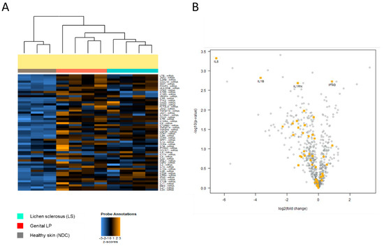 Molecular separation of lichen sclerosus, genital lichen planus, and healthy controls by gene expression profiling. NanoString technology was applied to compare the expression of 730 inflammation-related genes across lesional skin samples from Lpg (n = 4), LS (n = 4), and NDC (n = 3) samples. Heatmap visualization shows hierarchical clustering of genes in Lpg, LS, and NDC samples (A). Comparative analysis between LS and Lpg specimens identified 104 differentially expressed genes, with a predominance of upregulated genes in Lpg (86 genes) vs. LS (18 genes) (B). LS, lichen sclerosus; Lpg, lichen planus genitalis; NDC, non-diseased controls.