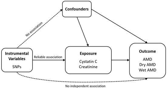 Mendelian randomization (MR) uses genetic variation as an instrumental variable (IV) to identify potential causal links between risk factors and diseases [24,25,26]. Recent MR studies have been applied to clarify the causal relationships between systemic biomarkers (lifestyle, inflammation and metabolic factors) and AMD risk, offering insights beyond observational limitations [27,28,29,30]. These findings underscore the utility of MR in identifying potentially modifiable risk factors for AMD. This technique is based on the idea that genetic variants occur randomly at conception and are unaffected by conventional confounders. Because of this random allocation, MR analysis is less prone to confounding and reverse causality biases than traditional observational studies. In our study, we used a two-sample MR approach to investigate the causal relationships of the renal function markers cystatin C and creatinine with AMD and its subtypes (dry AMD, wet AMD) in a European population.