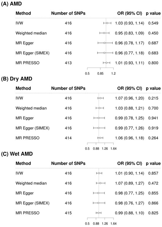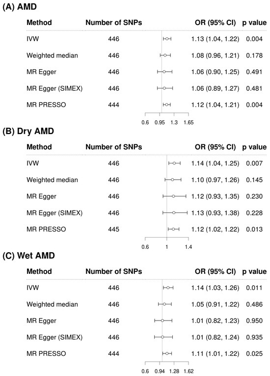 Figure 2 illustrates the analysis of cystatin C as an exposure and its associations with AMD and its subtypes. The IVW method demonstrated a significant association, indicating that higher cystatin C levels are associated with increased risk of AMD (OR = 1.13, 95% CI: 1.04 to 1.22, p = 0.004 for overall AMD; OR = 1.14, 95% CI: 1.04 to 1.25, p = 0.007 for dry AMD; OR = 1.14, 95% CI: 1.03 to 1.26, p = 0.011 for wet AMD). Although the weighted median and MR-Egger methods did not reach statistical significance, the effect estimates were directionally consistent with the IVW results (Figure 2). Confirmatory results were provided by the MR-PRESSO method, also included in Figure 2, which also supported the significant findings of the IVW method, particularly for overall AMD (OR = 1.12, 95% CI: 1.04 to 1.22, p = 0.004), dry AMD (OR = 1.12, 95% CI: 1.02 to 1.22, p = 0.013), and wet AMD (OR = 1.11, 95% CI: 1.01 to 1.22, p = 0.025). The MR-PRESSO distortion test indicated no significant difference in causal estimates before and after outlier correction (p = 0.852 for AMD, 0.714 for dry AMD, and 0.581 for wet AMD), confirming that outlier removal did not materially influence the overall results. Our comprehensive MR analysis consistently demonstrated that serum creatinine levels (Figure 3) did not significantly impact the risk of AMD or its subtypes. The direction of the observed associations did not indicate a consistent increase or decrease in AMD risk associated with changes in creatinine levels across all evaluated MR methods of IVW, weighted median, MR-Egger, and MR-PRESSO. The MR-PRESSO distortion test likewise showed no significant change in causal estimates after outlier correction (p = 0.317 for AMD, 0.838 for dry AMD, and 0.108 for wet AMD). In the IVW analyses, genetically predicted cystatin C had high power for AMD (97%) and dry AMD (93%), and still adequate power for wet AMD (86%). When power was recalculated using the MR-PRESSO estimates, power for cystatin C remained high for AMD (94%) and dry AMD (83%), but decreased for wet AMD to 67%. By contrast, analyses using serum creatinine as the exposure were underpowered (14% for AMD, 39% for dry AMD, and 6% for wet AMD; 6–30% with MR-PRESSO), so the non-significant creatinine results should be interpreted cautiously (Supplementary Table S2).