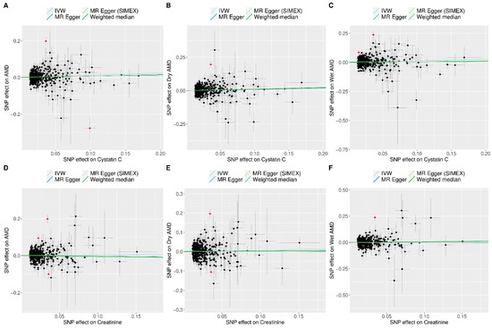 Scatter plots of MR tests assessing the effects of cystatin C or creatinine levels on AMD, dry AMD, and wet AMD. Scatter plot indicating the effects of cystatin C on AMD (A), dry AMD (B), and wet AMD (C) as well as those of creatinine on AMD (D), dry AMD (E), and wet AMD (F). Light blue, dark blue, light green, and dark green regression lines represent the IVW, MR-Egger, MR-Egger (SIMEX), and weighted median estimates, respectively. The slope of the line represents the causal effect of each method. Each dot corresponds to a SNP, with the x-axis representing the association between the SNP and the exposure, and the y-axis representing the association between the SNP and the outcome. Red dots indicate outliers in the MR-PRESSO analysis. Abbreviations: AMD, age-related macular degeneration; IVW, inverse-variance weighted; MR, Mendelian randomization; PRESSO, pleiotropy residual sum and outlier; SIMEX, simulation extrapolation; SNP, single-nucleotide polymorphism.