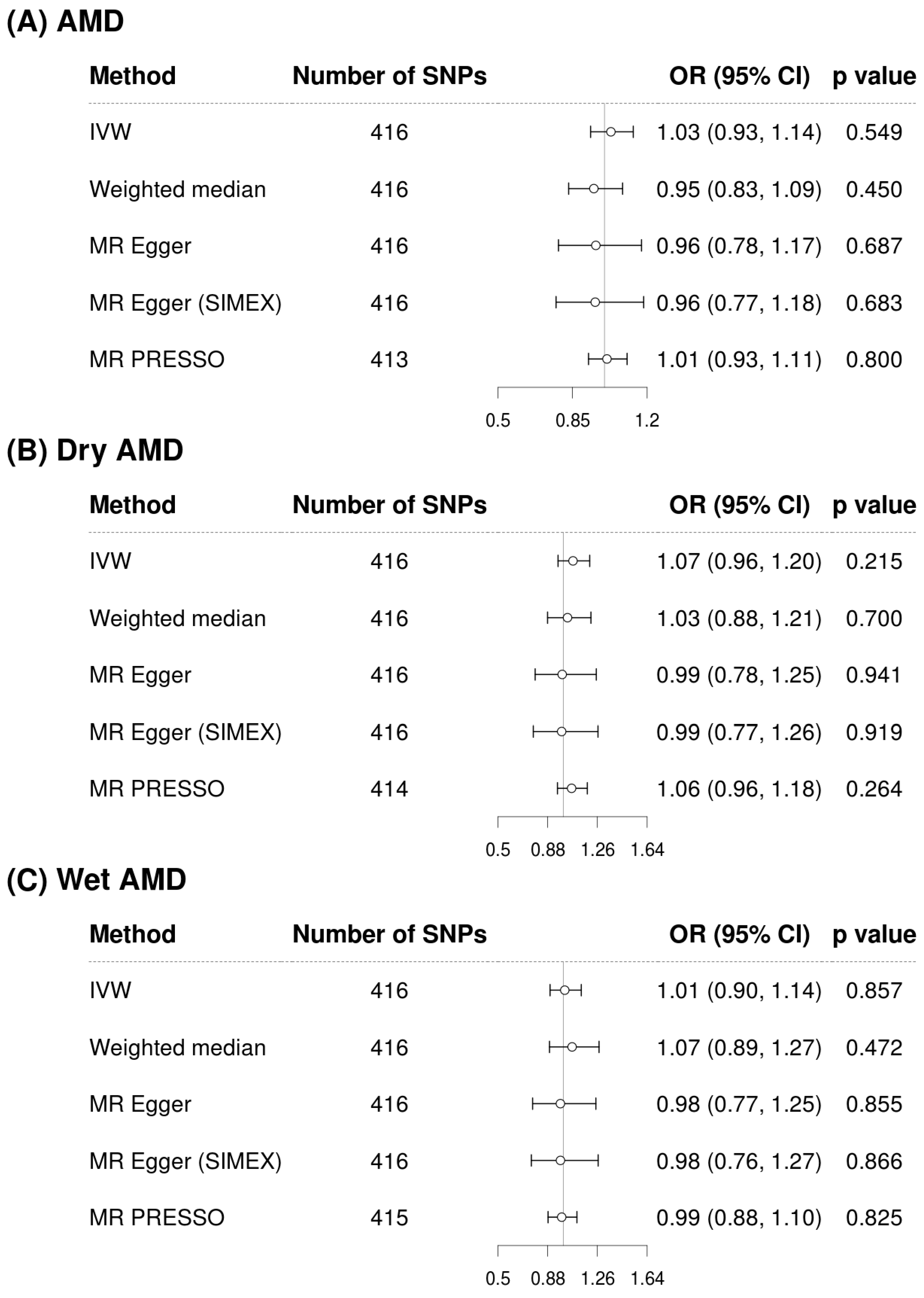 Figure 2. Forest plots of causal associations of cystatin C with AMD, dry AMD, and wet AMD. Abbreviations: AMD, age-related macular degeneration; CI, confidence interval; IVW, inverse-variance weighted; MR, Mendelian randomization; OR, odds ratio; PRESSO, pleiotropy residual sum and outlier; SIMEX, simulation extrapolation; SNP, single-nucleotide polymorphism.