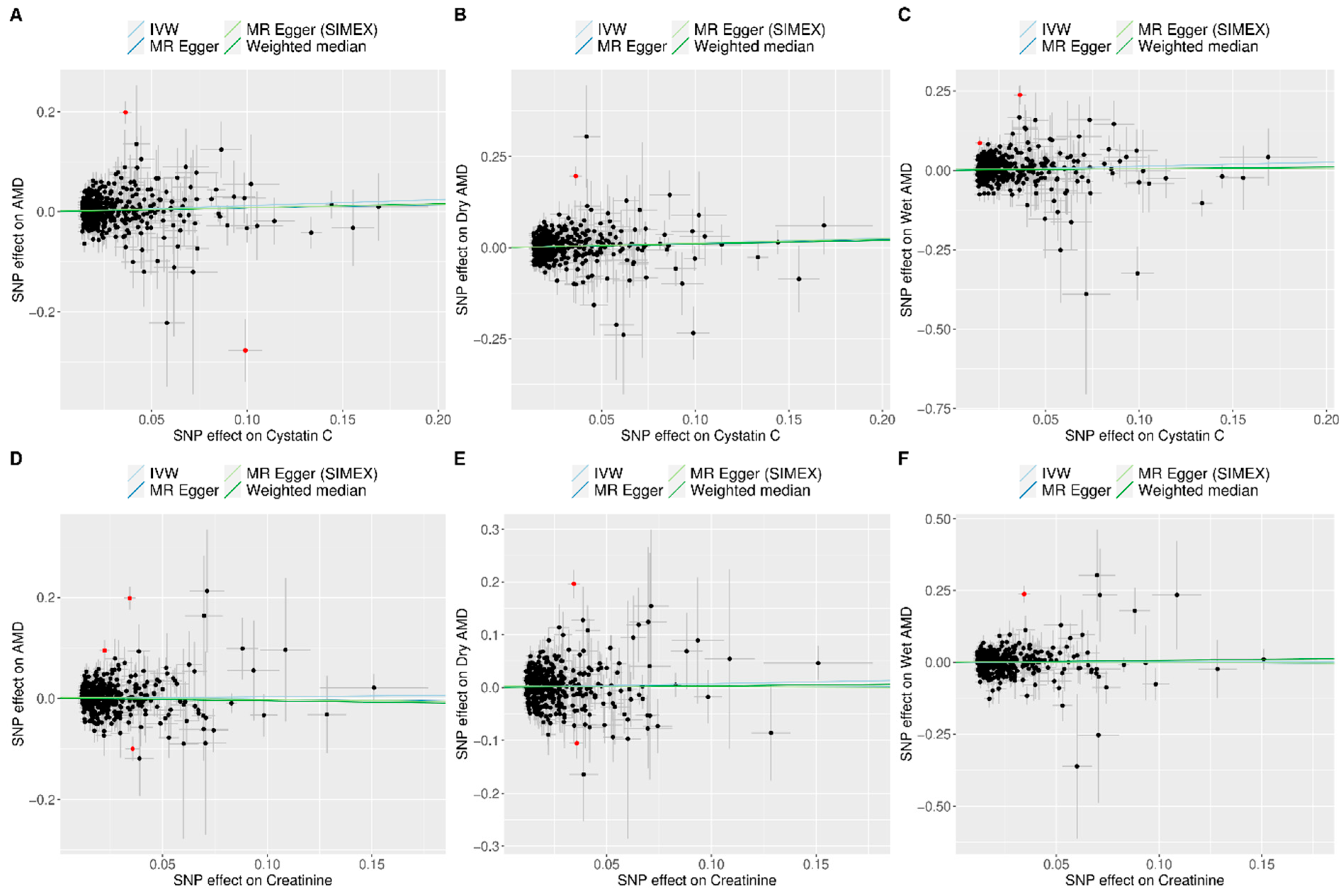 Figure 4. Scatter plots of MR tests assessing the effects of cystatin C or creatinine levels on AMD, dry AMD, and wet AMD. Scatter plot indicating the effects of cystatin C on AMD (A), dry AMD (B), and wet AMD (C) as well as those of creatinine on AMD (D), dry AMD (E), and wet AMD (F). Light blue, dark blue, light green, and dark green regression lines represent the IVW, MR-Egger, MR-Egger (SIMEX), and weighted median estimates, respectively. The slope of the line represents the causal effect of each method. Each dot corresponds to a SNP, with the x-axis representing the association between the SNP and the exposure, and the y-axis representing the association between the SNP and the outcome. Red dots indicate outliers in the MR-PRESSO analysis. Abbreviations: AMD, age-related macular degeneration; IVW, inverse-variance weighted; MR, Mendelian randomization; PRESSO, pleiotropy residual sum and outlier; SIMEX, simulation extrapolation; SNP, single-nucleotide polymorphism.
