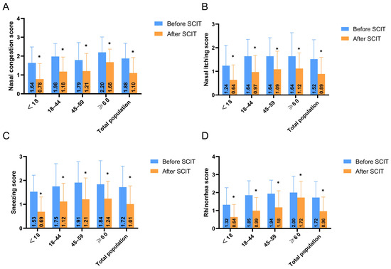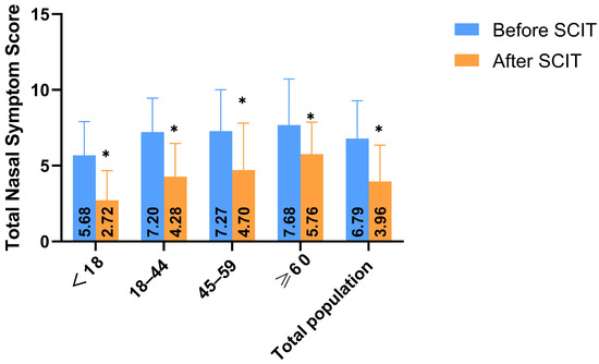 Age-stratified analysis results of the total nasal symptom scores before and after SCIT treatment, * p < 0.0125. The total nasal symptom scores of all age groups decreased compared with those before treatment, and the differences were significant (p < 0.0125).
