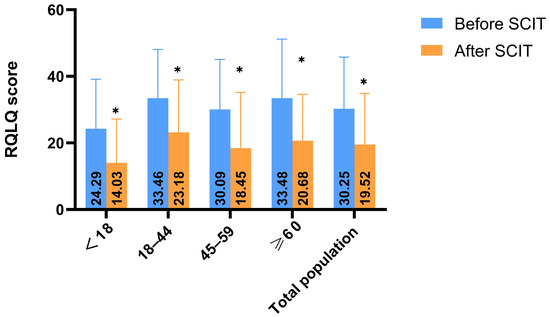 Age-stratified analysis results of RQLQ before and after SCIT treatment, * p < 0.0125. The RQLQ scores of all age groups decreased compared with those before treatment, and the differences were significant (p < 0.0125).
