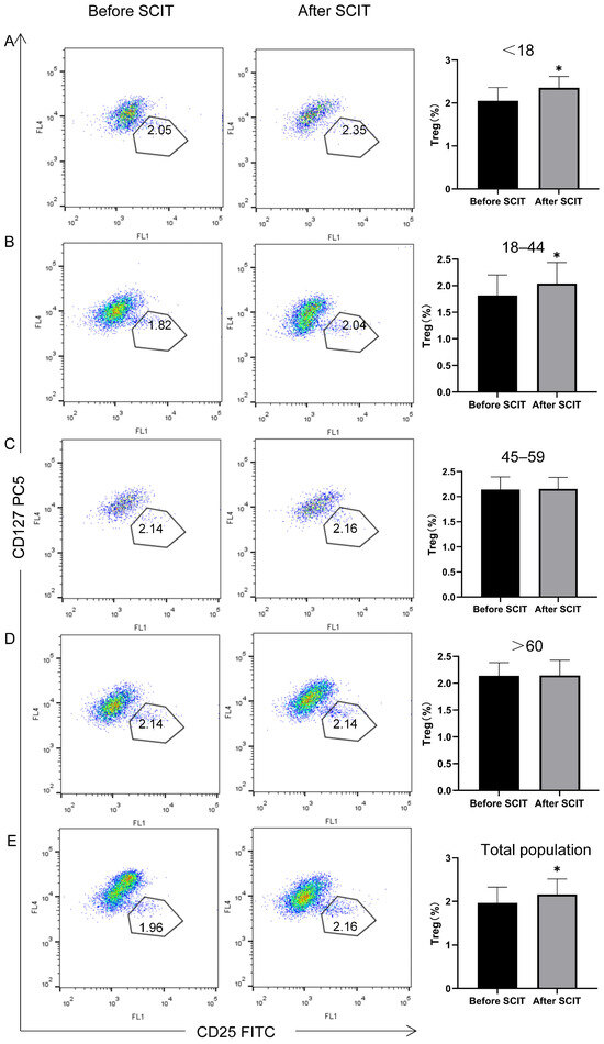 Age-stratified analysis of the flow cytometry detection results of peripheral blood Treg before and after SCIT treatment, * p < 0.0125. In the flow scatter plots, different color clusters represent different cell populations, and the target cell population is defined by gating (the circled area in the figure). The left side shows the flow scatter plots before treatment, the middle shows those after treatment, and the right side shows the statistical bar charts of the Treg cell populations in the corresponding age groups ((A) <18 years old; (B): 18–44 years old; (C) 45–50 years old; (D) >60 years old)/total population (E) before and after treatment. The number of Treg cells in the elderly and middle-aged groups (C,D) showed little change after treatment (no significant difference).