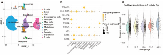 To investigate the immunological mechanisms underlying the age-related decline in SCIT efficacy, we conducted a bioinformatic re-analysis of a publicly available single-cell RNA sequencing (scRNA-seq) dataset of human nasal mucosa (GEO accession: GSE176269), comprising 35 healthy donors aged 4 months to 65 years [35].