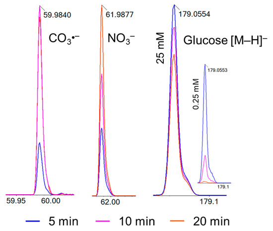 After plasma treatment, significant quantities of carbonate radicals (CO3•−; m/z 59.98) and nitrate (NO3−; m/z 61.99), were detected (Figure 3), while glucose molecules (m/z 179.05) were decomposed (Figure 2A and Figure 3). During plasma exposure, the pH of the treated aqueous solutions decreased substantially, from 5.8 in the untreated glucose solution to 3.4 after 20 min of plasma treatment (Supporting Information, Figure S7), consistent with our previously reported plasma-induced acidification in aqueous systems [10]. This acidification primarily arises from the dissolution of plasma-generated NO and NO2, forming nitric and nitrous acids (HNO3 and HNO2) [31], and secondarily from organic acid formation (e.g., formic, glycolic, and glyoxylic acids) during glucose oxidation [32]. As the treatment time increases, the peak area of the MS signal for CO3●− and NO3− increases (Figure 3, Table 2). Peroxynitrite is a strong oxidant that contributes to glucose decomposition. At the same time, oxidation-sensitive nitrite (NO2−, m/z 45.99), which is frequently detected in (buffered) liquids treated by argon plasmas like the kINPen, was observed in traces only reflecting the strongly oxidative environment created. Bicarbonate (HCO3−; m/z 61.06) present in the solution can react with hydroxyl radicals (•OH) to generate CO3•−, which also contributes to glucose decomposition [33]. Since carbonate radicals have a millisecond lifetime, the radical ions detected in mass spectrometry were generated in the electrospray ion source and represent carbonate ions. The non-monotonous change in their concentration with treatment time can be explained by (bi-) carbonate formation during glucose decomposition (decarboxylation of α-oxo carbonic acids), and their further decay. Carbonate radicals formed by the reaction between carbonate ions and hydroxyl radicals during plasma treatment may contribute to the glucose decomposition. Since they have a very low pKa (<0), their reactivity is independent of pH value, while the reactivity of target molecules, e.g., carboxylic acids, changes [34].