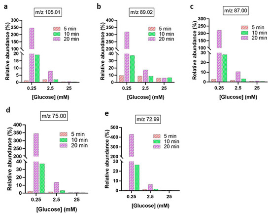 Relative abundances of downstream glucose oxidation products after plasma treatment from 5 to 20 min. (a) glycerate [C3H5O4 − H]−, (b) lactate [C3H5O3 − H]−, (c) pyruvate [C3H3O3 − H]−, (d) glycolic acid [C2H4O3 − H]−, (e) glyoxylate [C2HO3 − H]−. The abundance of each oxidation product is expressed as the ratio of its peak area and the peak area of non-oxidized glucose [C6H12O6 − H]− at m/z 179.05.