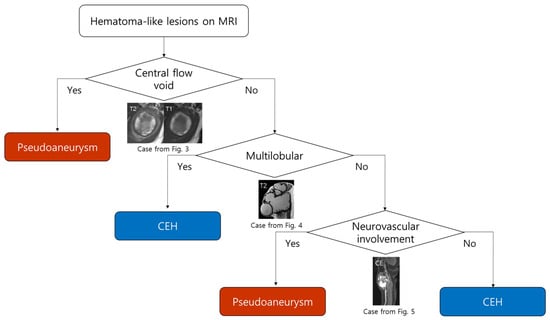 Both pseudoaneurysms and CEHs demonstrate overlapping hematoma-like features, such as outermost peripheral low signal on T1WI and occasional nodular enhancement [23]. This overlap likely explains why these lesions are often misclassified as either simple hematomas or hemorrhagic tumors in clinical practice, a pitfall that can significantly delay appropriate treatment or lead to harmful interventions [10]. Our study proposed a diagnostic flowchart that can be readily applied in daily practice; while pseudoaneurysms require prompt endovascular or surgical repair to prevent rupture and life-threatening hemorrhage [15,16], CEHs are more appropriately managed with surgical excision when symptomatic or enlarging [17]. Misclassification could result in catastrophic hemorrhage if a pseudoaneurysm was mistaken for a benign hematoma and biopsied, or in unnecessary intervention if a CEH was misinterpreted as a vascular lesion [11]. Our proposed flowchart—beginning with the evaluation of central flow voids, followed by that of morphology and neurovascular involvement—could provide radiologists and clinicians with practical diagnostic clues that can improve patient safety and optimize therapeutic strategies. This highlights the robustness of the proposed algorithm, even in cases lacking classic findings. Although inner peripheral high SI on T1WI was statistically significant, it was excluded from the flowchart because central flow void was a more reliable discriminator and one pseudoaneurysm case lacked this finding.