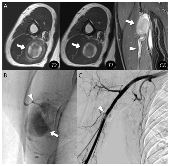 Diagnosis and treatment of pseudoaneurysm. (A) Axial T2-weighted, T1-weighted, and coronal T1-weighted contrast-enhanced MR images show an intramuscular, ovoid lesions (arrow) in the upper arm. The lesion demonstrates a central flow void with inner peripheral high SI on T1-weighted image (arrow, mural thrombus) with neurovascular involvement (arrowhead). (B) Digital subtraction angiography reveals a pseudoaneurysm sac (arrow) with a narrow neck arising from the brachial artery (arrowhead). (C) Post-embolization angiography demonstrates successful occlusion of the pseudoaneurysm neck (arrowhead).