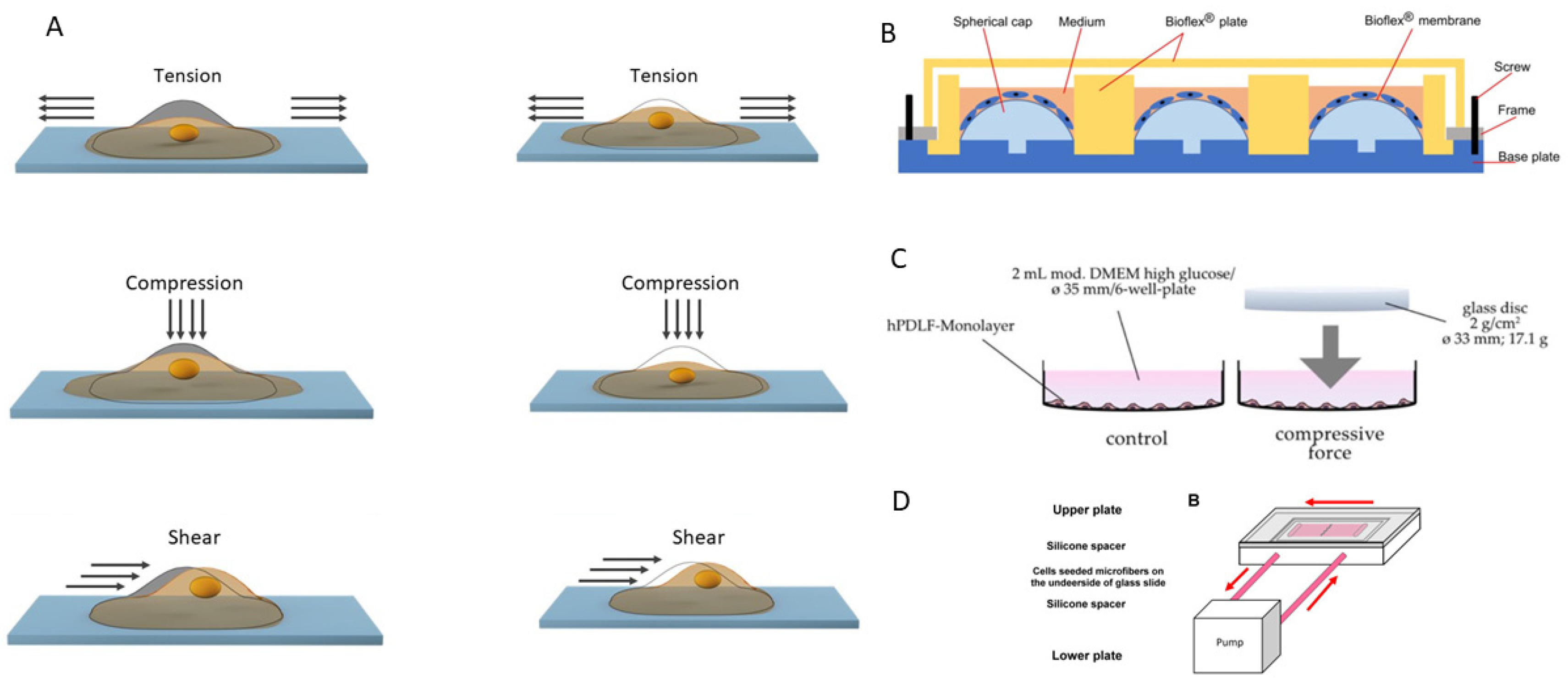 | Stretching | PDLSC | 6-well plate BioFlex® (Flexcell International Corporation, Burlington, VT, USA) with elastic membrane at the bottom; stretching achieved by a pushing mechanism from beneath the membrane. | RUNX2 (↑1d → ↓3d; ↑3% → ↓20%); ALPL (↑1d → ↓3d; ↑3% → ↓20%); Osterix (↑1d → ↓3d; ↑3% → ↑↑6% → ↓20%); OCN (↓1d → ↑3d; ↓3% → ↑↑10% → ↑↑15% → ↑20%); FOS (↓1d →-↑3d; no dependence on the percentage of stretching.); IL6 (↑1d → ↓3d; ↑3% → ↓10% → ↑20%); PTGS2 (↑1d → ↓3d; ↓3% → ↑20%) | ___ | ↑ IL1β ↑ TNFα ↑ IL6 ↑ IL8 ↑ PGE2 | ___ | 3%, 6%, 10%, 15%, 20% | NA | 1, 2, 3 d | Low-glucose DMEM supplemented with 10% FBS, 2% MEM vitamins and 1% of antibiotic/antimycotic | [16] |
