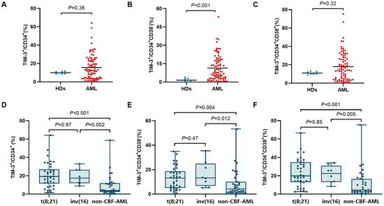 Frequencies of TIM-3+ cells across different genetic subtypes are shown in Figure 1D–F. t(8;21) and inv(16) patients exhibited no significant difference in the frequency of CD34+TIM-3+ cells (p = 0.97), but both exhibited markedly higher TIM-3+ frequencies than non-CBF-AML patients (19.3% (1.7–64.2%) vs. 4.0% (0.18–58.7%), p < 0.001; 17.5% (8.9–33.1%) vs. 4.0% (0.18–58.7%), p = 0.002). Similarly, no significant differences in TIM-3+ frequencies showed in CD34+CD38− and CD34+CD38+ cells between t(8;21) and inv(16) subtypes (p = 0.47 and 0.85), but both showed significantly higher TIM-3+ frequencies in CD34+CD38− cells (13.1% (0.24–34.9%) vs. 4.2% (0.21–53.2%), p = 0.004; 13.2% (5.1–35.4%) vs. 4.2% (0.21–53.2%), p = 0.012) and CD34+CD38+ cells (19.9% (2.7–66.6%) vs. 4.5% (0.10–75.4%), p < 0.001; 22.4% (8.5–34.1%) vs. 4.5% (0.10–75.4%), p = 0.005) compared to non-CBF-AML.