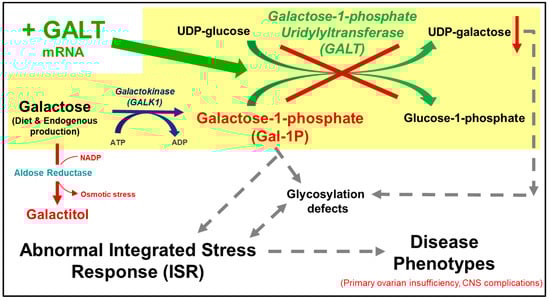 The Leloir pathway of galactose metabolism and the proposed pathobiology of galactose-1-phosphate uridylyltransferase (GALT) deficiency. Galactose, absorbed via diet or produced endogenously in a cell, is phosphorylated to form galactose-1-phosphate (Gal-1P). In the absence of GALT, the build-up of Gal-1P is thought to induce abnormal integrated response (ISR), which plays a role in the pathophysiology of the disease. Administration of GALT mRNA (green arrow) is expected to restore expression of GALT enzyme, thus effectively eliminating the Gal-1P accumulation.