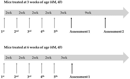 GalT-KO mice aged 3 and 6 weeks old were administered 100 µL of LNPs containing GALT mRNA via intravenous injection. The LNPs encapsulated mRNA were supplied by Moderna, Inc. (Cambridge, MA, USA). Each experimental group consisted of 8 mice (4 males and 4 females), which were randomly enrolled into treatment groups at time of weaning (Figure 2). The mice received five biweekly doses of GALT mRNA at a concentration of 2 mg/kg. No placebo or vehicle doses were administered to the wild type (WT) control or untreated GalT-KO groups for this study.