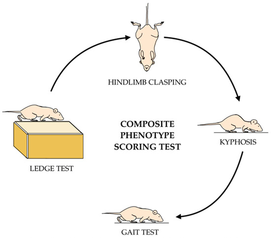 The composite phenotype scoring test was conducted in accordance with the protocol demonstrated by Guyenet et al. (Figure 3) [22]. This assessment consists of four parts—the ledge test, hindlimb clasping, kyphosis, and gait tests—each measured on a 0–3 scale. The overall composite score is the combined scores from each of the four assessments, where a higher score signifies a more severe manifestation of disease phenotype (score 0–12). Two blinded investigators were assigned to evaluate the composite score test where they would average the two scores given if they differed. Half-scores were granted when the behavior did not align with the full-digit score.