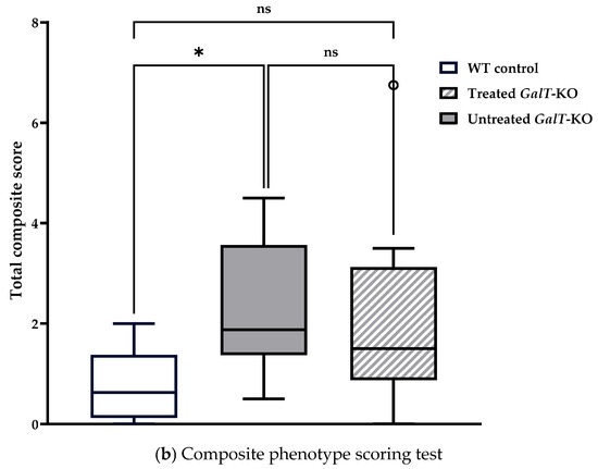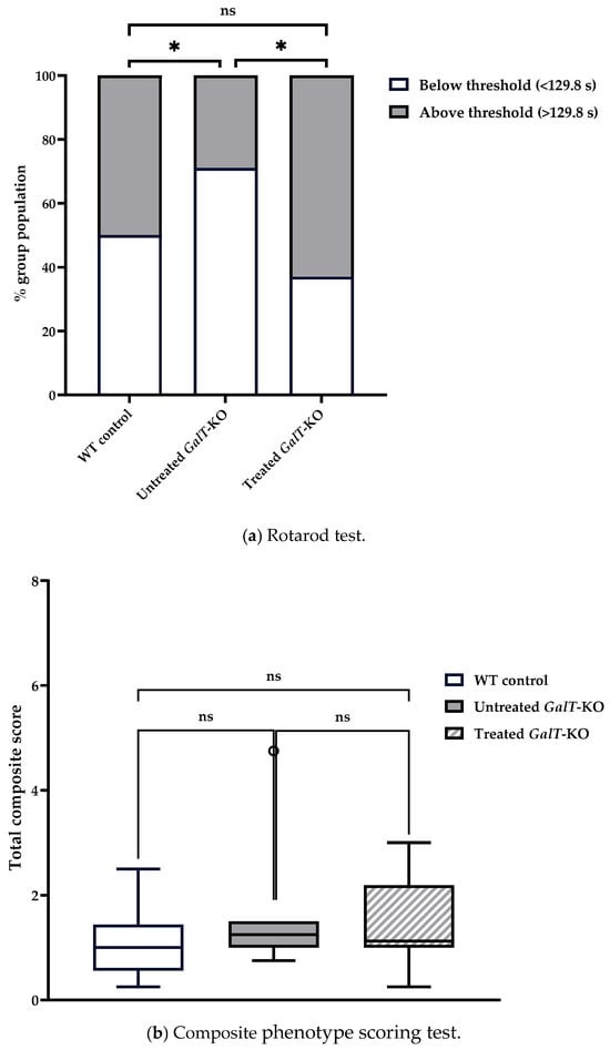 Motor function evaluation of cohort 1 at 12 weeks after GALT mRNA treatment ended. (a) Rotarod performance distribution of WT treated and untreated animals. The majority of treated GalT-KO animals performed above the WT control group median latency, whereas the untreated mutant animals mostly performed under this threshold. (b) Composite phenotype scoring test yielded no significantly different performances between treatment groups. WT and untreated GalT-KO groups demonstrated an improved mean composite score from the first assessment, while mRNA-treated animals maintained their performance. Data represent mean ± SEM. Statistical significance was determined using Mann–Whitney U test. General linearized models with Gaussian distribution were run in R to determine the effect of treatment type on rotarod and composite scoring test performances (see Supplementary Materials). ns = not significant, * p < 0.05.