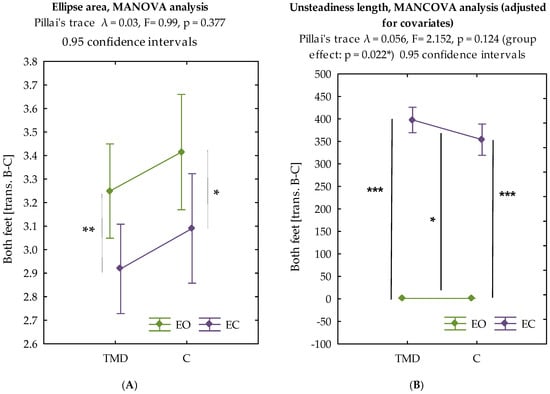 Interaction plot for transformed data of ellipse area and unsteadiness length for study groups. (A) Ellipse area [transformed values] for eyes open (EO) vs. eyes closed (EC) conditions; (B) Unsteadiness length [transformed values] for EO vs. EC conditions. Legend: TMD = temporomandibular disorders; C = control group; EO = eyes open; EC = eyes closed. Legend: *—p < 0.05; **—p < 0.01; ***—p < 0.001, between groups (adjusted for sex, height, BMI).
