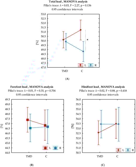 Interaction plot for total, forefoot and hindfoot load for study groups. (A) Total load distribution between left (L) and right (R) feet; (B) Forefoot load distribution [%]; (C) Hindfoot load distribution [%]. Legend: TMD = temporomandibular disorders; C = control group; L = left foot; R = right foot; *—p < 0.05.