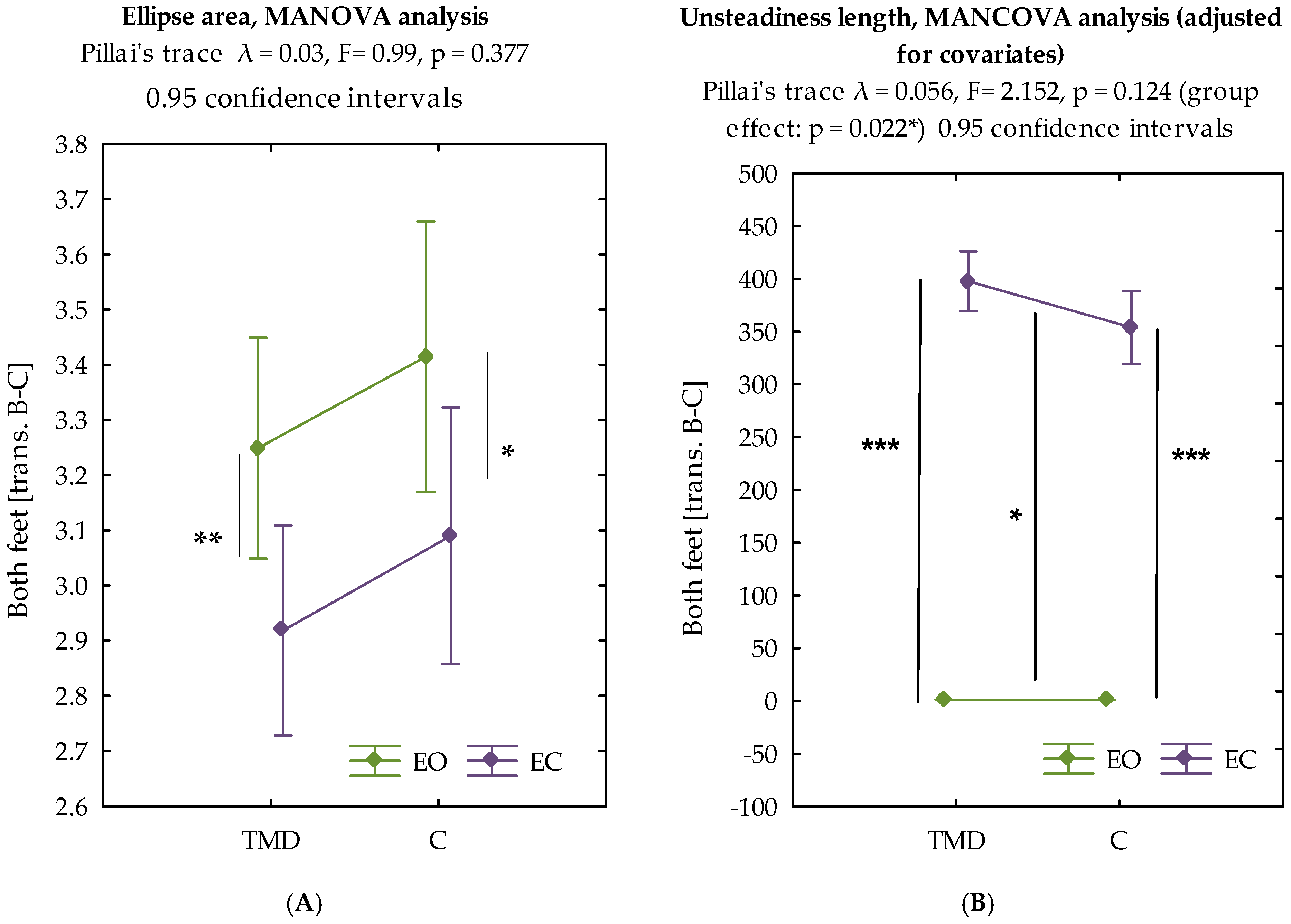 - Reutimann, S.; Hill-Strathy, M.; Krewer, C.; Bergmann, J.; Müller, F.; Jahn, K.; Rauen, K. Influence of footwear on postural sway: A systematic review and meta-analysis on barefoot and shod bipedal static posturography in patients and healthy subjects. Gait Posture 2022, 92, 302–314. [Google Scholar] [CrossRef] [PubMed]
