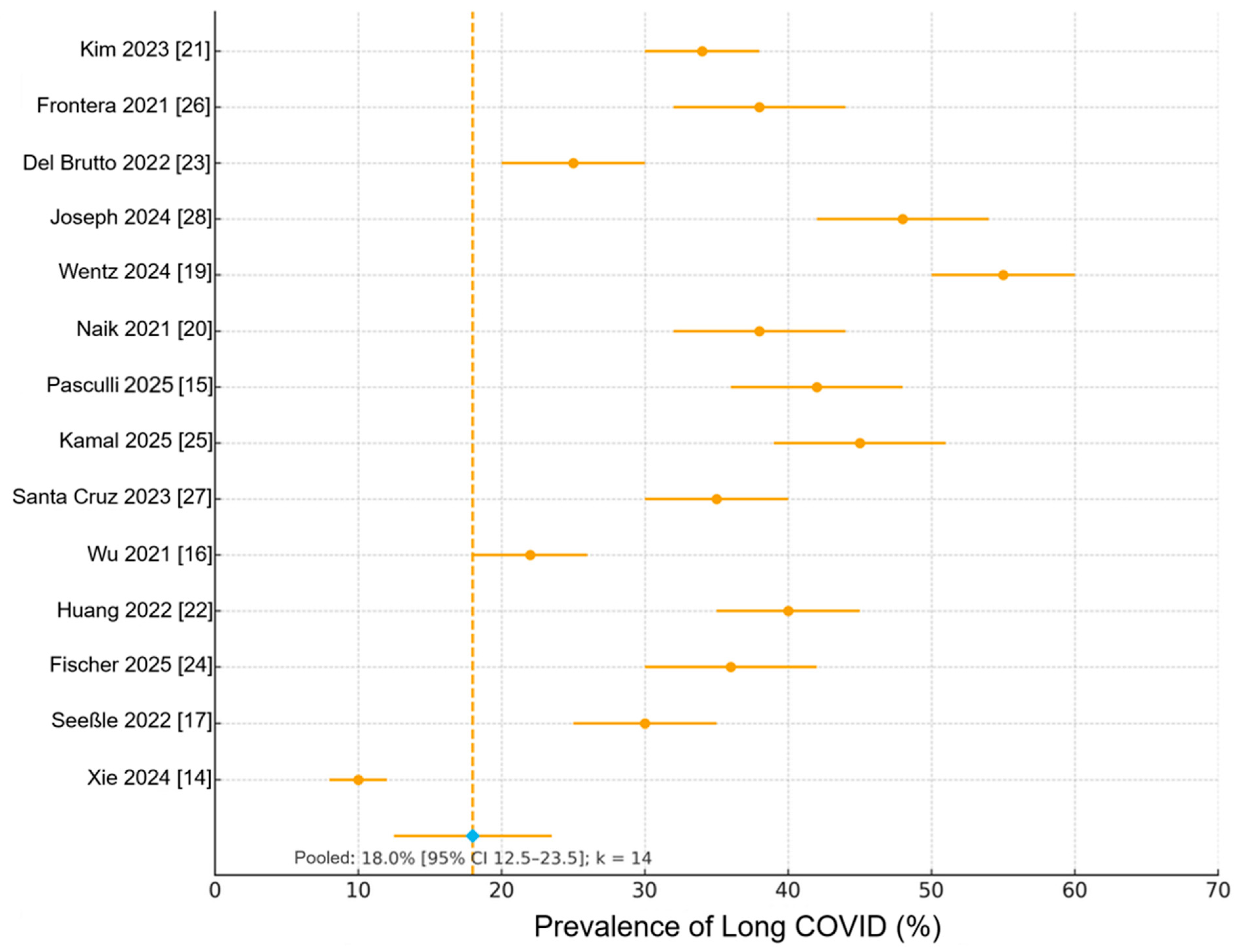 | 8 | Kamal SM (2025) [25] | Saudi Arabia | 4-year prospective cohort | 816 | 48 months | Fatigue (57.1%), post-exertional malaise (45.8%), cough (41.2%), cognitive dysfunction (30.7%) | Diabetes, reinfection | 9 | Community (national follow-up registry) | 53.6% |