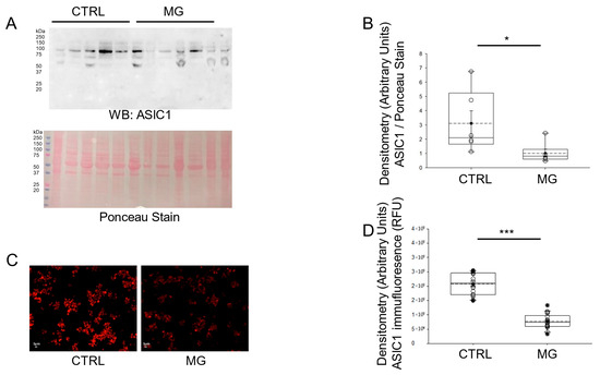 Western blot and densitometric analysis of ASIC1 protein expression in human platelets subject to normal gravity control (CTRL) or simulated microgravity (MG) conditions. (A) Western blot of ASIC1 protein expression in lysates from platelets of healthy donors subject to normal gravity control (CTRL) or simulated microgravity (MG) conditions for 5 days. Platelets from n = 6 donors. (B) Densitometric Analysis of the immunoreactive bands for ASIC1 in panel (A). (C) Representative Immunofluorescence microscopy images of ASIC1 protein expression in fixed platelets from healthy donors subject to normal gravity control (CTRL) or simulated microgravity (MG) conditions for 5 days. (D) Densitometric analysis of 18 platelets from each human donor subject to normal gravity control (CTRL) or simulated microgravity (MG) conditions for 5 days. Platelets from n = 3 donors. * represents a p-value < 0.05, *** represents a p-value < 0.001. The dashed line within the box plots represents the median.