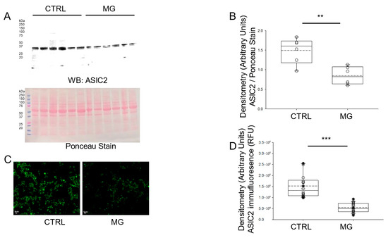 Western blot and densitometric analysis of ASIC2 protein expression in human platelets subject to normal gravity control (CTRL) or simulated microgravity (MG) conditions. (A) Western blot of ASIC2 protein expression in lysates from platelets of healthy donors subject to normal gravity control (CTRL) or microgravity (MG) conditions for 5 days. Platelets from n = 6 donors. (B) Densitometric Analysis of the immunoreactive bands for ASIC2 in panel (A). (C) Representative Immunofluorescence microscopy of ASIC2 protein expression in fixed platelets from healthy donors subject to normal gravity control (CTRL) or simulated microgravity (MG) conditions for 5 days. (D) Densitometric analysis of 18 platelets from each human donor subject to normal gravity control (CTRL) or simulated microgravity (MG) conditions for 5 days. Platelets from n = 3 donors. ** represents a p-value < 0.01, *** represents a p-value < 0.001. The dashed line within the box plots represents the median.