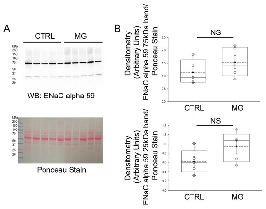 Western blot and densitometric analysis of ENaC alpha protein expression in human platelets subject to normal gravity control (CTRL) or simulated microgravity (MG) conditions. (A) Western blot of ENaC protein expression in lysates from platelets of healthy donors subject to normal gravity control (CTRL) or simulated microgravity (MG) conditions for 5 days. Platelets from n = 5 donors. (B) Densitometric Analysis of the immunoreactive bands for ENaC alpha in panel A. NS represents no significance between the groups. The dashed line within the box plots represents the median.