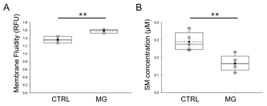Relative membrane fluidity and sphingomyelin concentrations in human platelets subjected to microgravity and normal gravity conditions. (A) Summary plot of relative membrane fluidity in human platelets subject to simulated microgravity (MG) and normal gravity (CTRL) conditions. (B) Summary plot of relative sphingomyelin concentration in human platelets subject to simulated microgravity and normal gravity conditions. CTRL refers to control normal gravity conditions. n = 5 samples per group. ** represents a p-value < 0.01. The dashed line within the box plots represents the median.