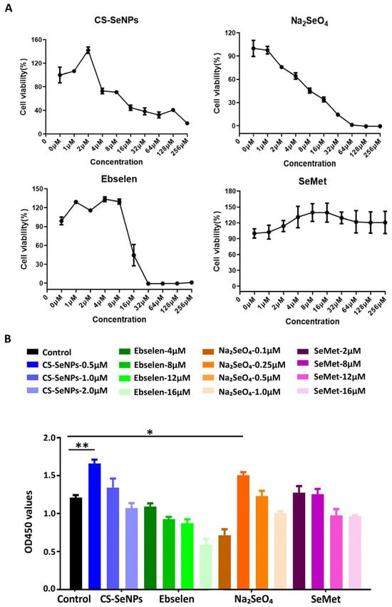 To investigate the optimal concentrations of different selenium compounds, CCK8 assays were conducted to compare the proliferation rates of hUC-MSCs cultured with different concentrations of the different selenium compounds (0 μM, 1 μM, 2 μM, 4 μM, 8 μM, 16 μM, 32 μM, 64 μM, 128 μM and 256 μM) [,,]. As shown in Figure 1A, CS-SeNPs, ebselen and SeMet promoted cell proliferation to a certain degree at concentrations above 1 μM. However, 2 μM or higher concentrations of CS-SeNPs, 1 μM or higher concentrations of Na2SeO4, 8 μM or higher concentrations of ebselen and 32 μM or higher concentrations of SeMet have been shown to be toxic to hUC-MSCs and cause cell death. We further optimized the concentrations of these selenium compounds, with CS-SeNPs (0 μM, 0.5 μM, 1.0 μM and 2 μM), Na2SeO4 (0 μM, 0.1 μM, 0.25 μM, 0.5 μM and 1.0 μM), ebselen (0 μM, 4 μM, 8 μM, 12 μM and 16 μM) and SeMet (0 μM, 2 μM, 8 μM, 12 μM and 16 μM). Compared with those in the control group, the proliferation rates of hUC-MSCs were significantly increased following treatment with 0.5 μM CS-SeNPs or 0.25 μM Na2SeO4 after incubation for 72 h (Figure 1B). Thus, 0.5 μM CS-SeNPs and 0.25 μM Na2SeO4 were selected as the optimal concentrations for further experiments.