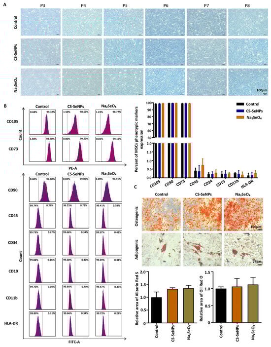 To investigate the potential impact of these selenium agents on the basic characteristics of hUC-MSCs, we first examined the cellular morphology of hUC-MSCs after treatment with CS-SeNPs or Na2SeO4. The morphology of cells from the control and selenium compound groups at passages P3 to P8 is shown in Figure 2A. The size of the hUC-MSCs at passages P3 and P8 was relatively uniform. Similar to the cells from the control group, no obvious morphological differences were detected in the hUC-MSCs from the CS-SeNPs group and the Na2SeO4 group. Furthermore, the phenotypic marker profiles of the hUC-MSCs were analyzed at P3 via flow cytometry. The hUC-MSCs in the CS-SeNPs, Na2SeO4 and control groups presented expression of the phenotypic markers CD105 (98.48 ± 0.44 versus 98.86 ± 0.42 versus 99.19 ± 0.34), CD73 (99.05 ± 0.47 versus 99.02 ± 0.58 versus 99.20 ± 0.14) and CD90 (99.43 ± 0.26 versus 99.44 ± 0.49 versus 99.59 ± 0.31), and low expression of the negative markers CD45, CD34, CD19, CD11b and HLA-DR (Figure 2B). These data suggested that the expression of phenotypic markers was not affected by the selenium compounds.