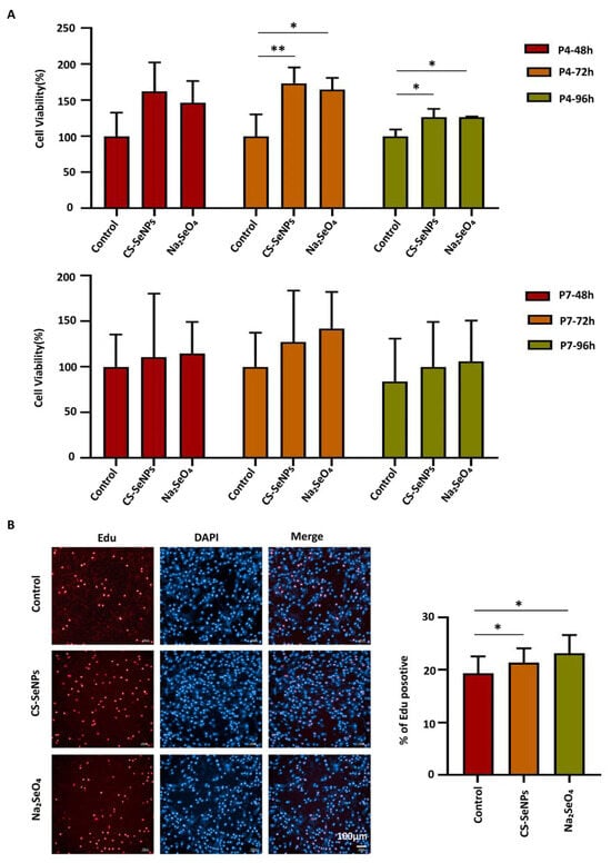 Effects of selenium compounds on the proliferative capacity of hUC-MSCs. (A) CCK8 assays were performed to assess the viability of the hUC-MSCs in the CS-SeNPs and Na2SeO4 groups. The data are from three independent biological replicates (n = 3) and are presented as the means ± SDs. (B) EdU assays were used to analyze the proliferation rate of hUC-MSCs in the CS-SeNPs and Na2SeO4 groups. The data are from three independent biological replicates (n = 3) and are presented as the means ± SDs. * p < 0.05, ** p < 0.01.