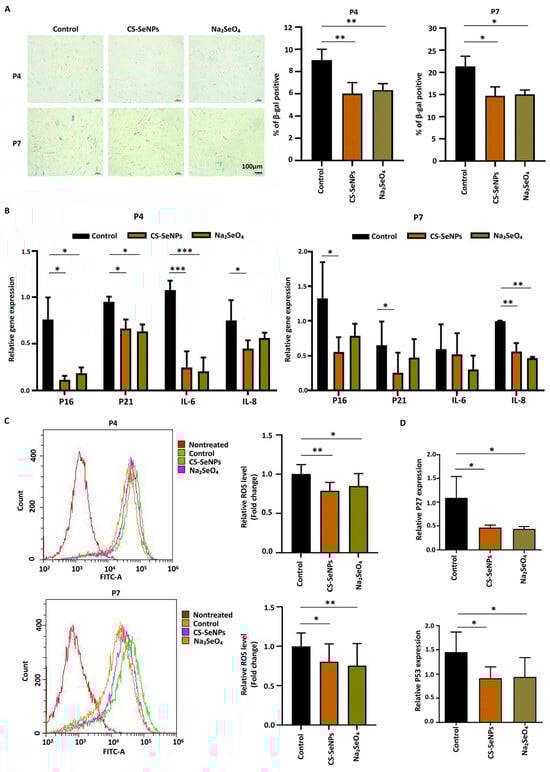 Next, intracellular ROS levels were measured to assess the impact of selenium on hUC-MSCs. At both P4 and P7, the relative ROS level was significantly reduced in the CS-SeNPs and Na2SeO4 groups compared to the control group. Specifically, the values were 0.79 ± 0.11 (CS-SeNPs) and 0.85 ± 0.16 (Na2SeO4) at P4, and 0.80 ± 0.23 (CS-SeNPs) and 0.75 ± 0.28 (Na2SeO4) at P7, versus the control (1.00) (Figure 4C), confirming the potent antioxidant effects of these selenium forms. These findings suggested that the proliferation-promoting effect and anti-senescence effect of selenium on hUC-MSCs are correlated with their antioxidant properties.