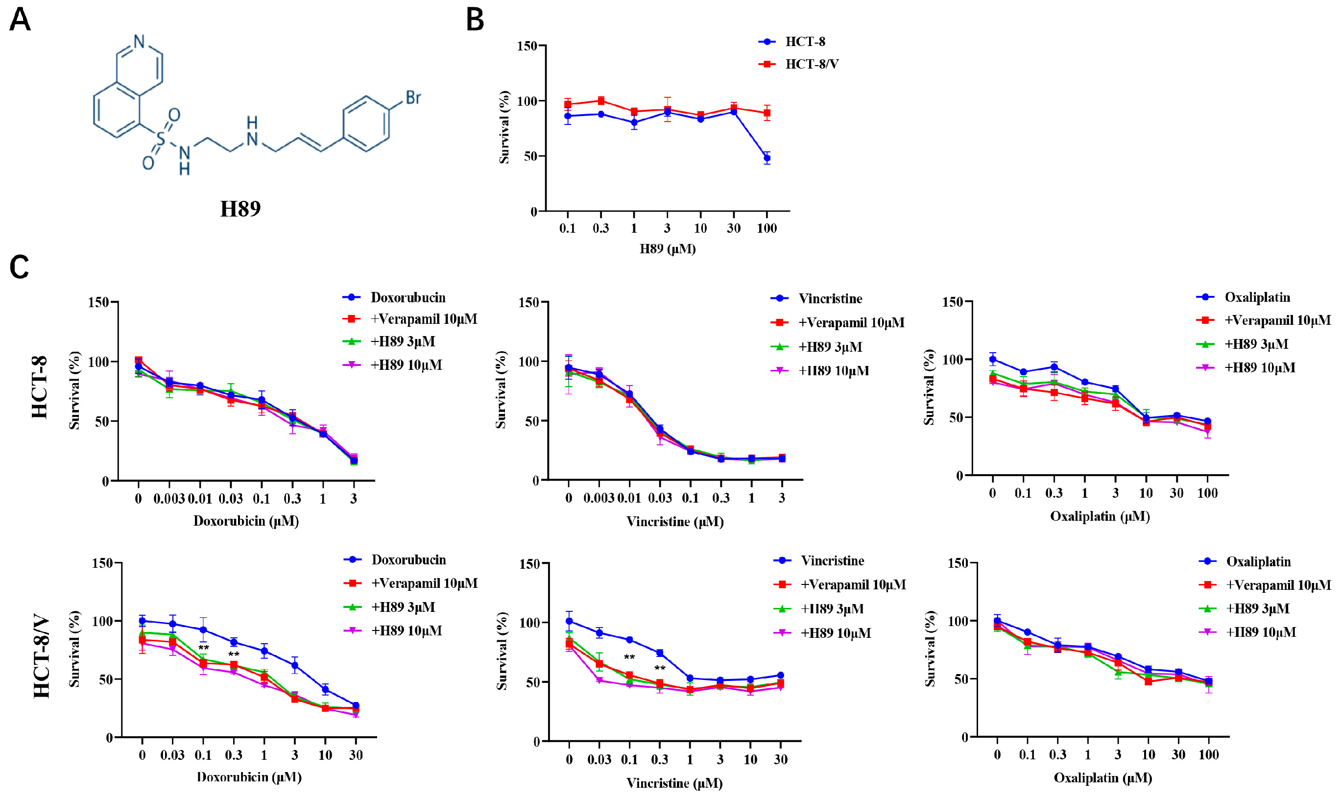 Figure 1. H89 reverses ABCB1-mediated MDR in CRC cells. (A) The chemical structure of H89. (B,C) Cells were treated with the indicated drugs for 72 h and detected by MTT assay. Representative cell viability curves are shown. ** p < 0.01 compared to the corresponding control groups. Data are presented as mean ± SD (n = 3).