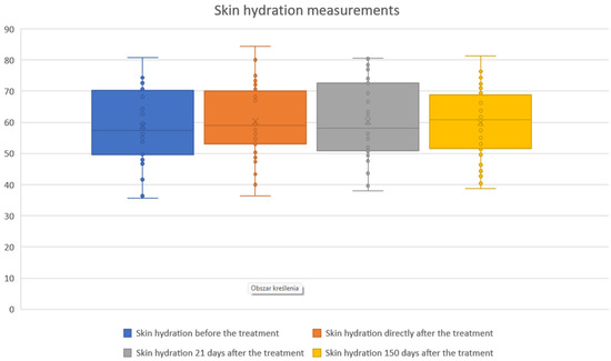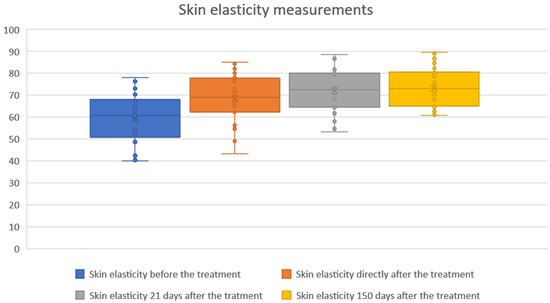 All patients underwent cutometric measurements regarding skin elasticity and hydration. The cutometric evaluation was carried out using the Courage + Khazaka Multi Skin Test Center MC1000 device in standardized conditions of temperature (22–23 °C) and air humidity (55–60%). The procedure of patient preparation for the examination was also standardized (make-up was removed at least one hour before measurement without using alcohol-based products). Measurements were performed by properly trained personnel on the skin of the buccal region. Skin elasticity and hydration were assessed on a 1–100 scale, where 1 represents the worst and 100 the best outcome. Three point-by-point measurements were obtained for each patient, and the average values were recorded in the observation chart for subsequent statistical analysis.