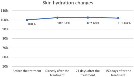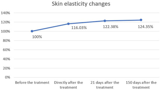 Cutometric analysis revealed significant improvements in skin elasticity as early as 5 days post-treatment, with progressive enhancement observed at 21 and 150 days (Figure 2 and Figure 3; Table 1). This temporal pattern suggests that infrared-induced dermal heating initiates both immediate and sustained remodeling processes. Such long-term gains align with earlier studies, where infrared therapy was shown to stimulate neocollagenesis and matrix reorganization over several months [16,24]. Similar long-term improvements in elasticity were also reported by Lee et al., who demonstrated that far-infrared exposure significantly increased fibroblast collagen and elastin production and translated clinically into noticeable enhancement of skin tightness [24]. In contrast, skin hydration exhibited only modest improvements, peaking at 21 days and slightly declining by 150 days (Figure 4 and Figure 5; Table 2), suggesting that hydration changes may reflect transient epidermal barrier modulation rather than durable dermal restructuring.