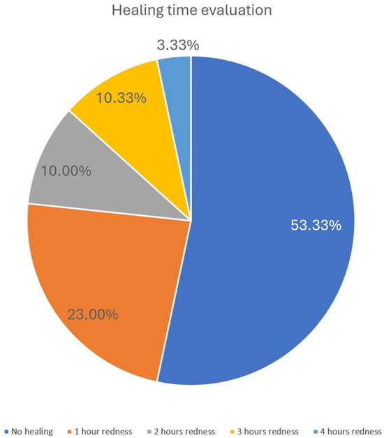 The assessment of healing time was based on patient self-observation. Two parameters were evaluated: the duration of post-procedural redness and swelling. To minimize subjectivity and standardize reporting, patients were provided with visual reference guidelines adapted from the International Contact Dermatitis Research Group (ICDRG) scale (Figure 1). Although originally developed for evaluating reactions in patch testing for contact dermatitis, the ICDRG scale was selected as a structured, clinical-grade visual tool suitable for guiding consistent self-assessment of transient, mild skin responses. In this study, the scale was used exclusively to support standardized description of short-term erythema rather than for diagnostic purposes. This adaptation strategy allowed participants to classify visible changes more reliably, while acknowledging that the ICDRG scale has not been formally validated for esthetic self-assessment.