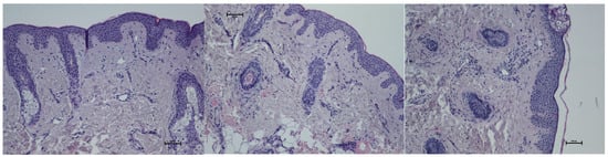 Skin samples were fixed for 24 h in neutral 10% buffered formalin (pH 7.2) and processed using an automated histoprocessor (Excelsior™ AS; Thermo Fisher Scientific, Waltham, MA, USA), following standard pathology protocols. The tissue blocks were sectioned at 5 μm for histological analysis and 3–4 μm for immunohistochemistry. Hematoxylin and eosin (H&E) staining was used to evaluate the cellular content and overall tissue architecture. Masson’s trichrome staining (Special Stain Kit Masson’s Trichrome, DiaPath, Martinengo, Italy) was performed to assess collagen structure.