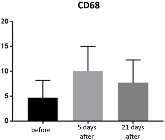 Histological analyses demonstrated a transient inflammatory infiltration, with its highest intensity observed at day 5 and resolving by day 21 (Figure 9 and Figure 10; Table 5). This mild and self-limiting inflammatory response is in line with the expected tissue reaction to sub-ablative thermal exposure, which serves as a stimulus for wound-healing pathways without inducing overt tissue damage [26]. Because biopsies were collected after the immediate acute phase (first 48–72 h), the infiltrate consisted mainly of mononuclear cells, supporting the focus on CD4+, CD8+, CD20+, and CD68+ markers rather than granulocyte-associated markers. Importantly, most changes in inflammatory markers (CD68, CD4, CD8, CD20), angiogenesis (CD31), and fibroblast activity (vimentin) were not statistically significant and should be interpreted as trends rather than definitive effects. These trends should also be interpreted in light of the small biopsy cohort, which may limit the sensitivity to detect subtle or heterogeneous tissue-level effects. The consistently low CD20+ levels suggest an absence of sustained humoral activation [27], while modest CD31 increases point toward early angiogenic activity [22]. A subtle and non-significant tendency toward increased CD68+ macrophages and CD4+ lymphocytes was observed, which may suggest the initiation of an early, remodeling-oriented immune response supporting matrix turnover and fibroblast activity (Figure 11, Figure 12, Figure 13 and Figure 14; Table 6 and Table 7). Overall, the findings indicate a mild, controlled post-acute remodeling response, though studies including earlier biopsy time points and larger biopsy cohorts would better characterize the acute granulocytic phase.