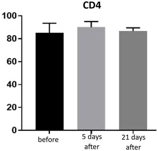 Th lymphocyte (CD4+) expression in skin samples. Bar graph showing the percentage of CD4+ cells within the inflammatory infiltrate at baseline (black), day 5 (light gray), and day 21 (dark gray) after treatment. No statistically significant differences were observed between time points.