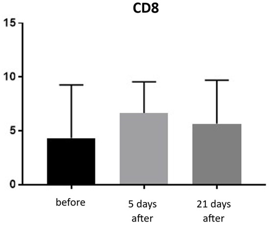 Expression of CD8 proteins was assessed on a scale representing 0–100% of inflammatory infiltrate cells. CD8 proteins are associated with the presence of cytotoxic T lymphocytes (Tc lymphocytes/T-killer cells) and are directly linked to the MHC class I antigen recognition system. Before treatment, the average CD8 expression was 4.33% of inflammatory infiltrate cells. On the 5th day after the procedure, this level increased to 6.66%. By day 21 post-procedure, the proportion of CD8-positive cells decreased slightly, reaching an average of 5.66% (Figure 15 and Figure 16; Table 8).