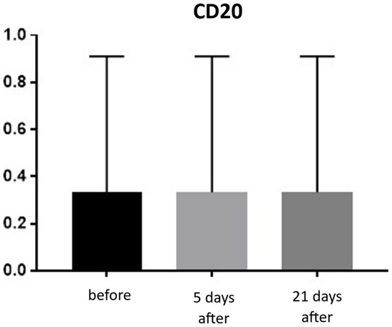 B lymphocyte (CD20+) expression in skin samples. Bar graph showing the percentage of CD20+ cells within the inflammatory infiltrate at baseline (black), day 5 (light gray), and day 21 (dark gray) after treatment. No significant differences were observed between time points.