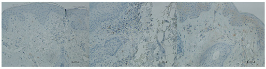 Representative vimentin immunohistochemical staining of skin samples. Images are shown from left to right: immediately before treatment, 5 days after treatment, and 21 days after treatment. Captured using an ECLIPSE E400 microscope (Nikon) at 20× magnification.