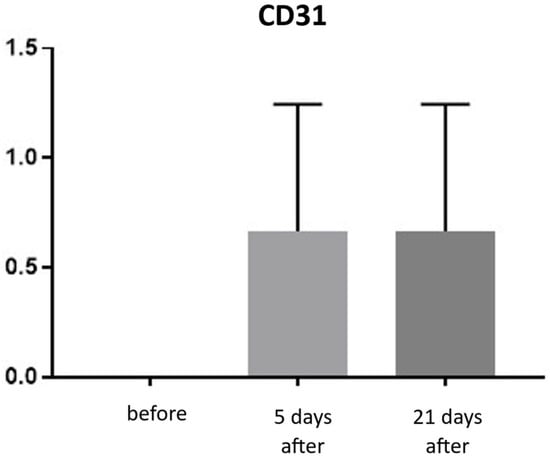 CD31 expression is associated with vascular endothelium and reflects angiogenesis, which, alongside neocollagenesis, is one of the expected effects of tissue revitalization procedures. The number of vessels was evaluated using the following scale: 0—few, thin-walled vessels; 1—increased number of vessels with slight wall thickening; 2—increased number of vessels with pronounced wall thickening. Before the procedure, the CD31 level was 0. At both 5 and 21 days post-treatment, the level increased to an average of 0.66 (Figure 19 and Figure 20; Table 10).
