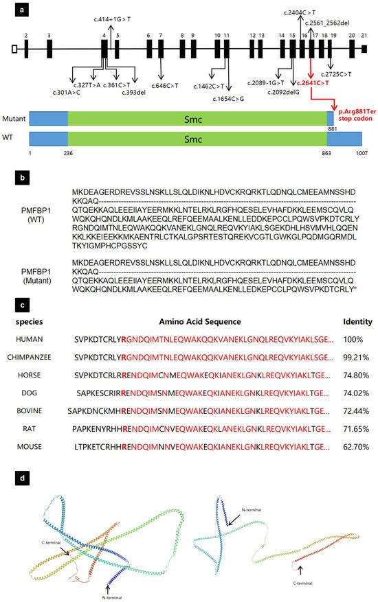 The analysis of the mutation in PMFBP1. (a) The location of identified PMFBP1 variants and ours. Our variant is annotated in red lines in the genomic structure of PMFBP1 and the PMFBP1 protein. Full-length PMFBP1 is 1007 AA and the Smc domain is from 236 to 863 AA (green box). The p. Arg881Ter mutation causes the protein coding to terminate at the 881st arginine. (b) The PMFBP1 protein variant. The asterisk (*) denotes a premature termination codon at this amino acid position, resulting in a truncated protein product. (c) Alignment of multiple PFMBP1 amino acid sequences across species. (d) Structural changes in the PFMBP1 protein based on SWISS-MODEL. PMFBP1: polyamine modulated factor 1 binding protein 1; Smc: the functional structural maintenance of chromosome region; AA: amino acid.