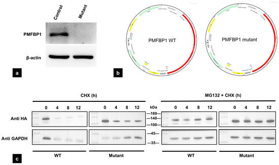 The mutant and wild-type (WT) PMFBP1 cDNAs were chemically synthesized by Sangon Biotech Company (Sangon Biotech (Shanghai) Co., Ltd., Shanghai, China) and subsequently cloned into a pcDNA3.1+C-HA vector, which could express PMFBP1 WT or mutant +HA fusion protein with the HA tagged at the C-terminus end of PMFBP1 WT. Then, the constructed plasmids were separately transfected into HEK-293T cells using Lipofectamine TM3000 reagent (Invitrogen, Carlsbad, CA, USA) for 24 h. The cells were cultured in DMEM (HyClone, Logan, UT, USA) supplemented with 10% fetal bovine serum (FBS) and 100 U/mL penicillin and streptomycin in a humidified 5% CO2 atmosphere. The HA-tagged PMFBP1 WT or mutant plasmids transfected into HEK-293T cells were treated with cycloheximide (CHX; 100 μmol/L) or with MG132 (10 μmol/L) for 0, 4, 8, and 12 h. After treatment, the cells were collected and analyzed by Western blot to determine the expression level.