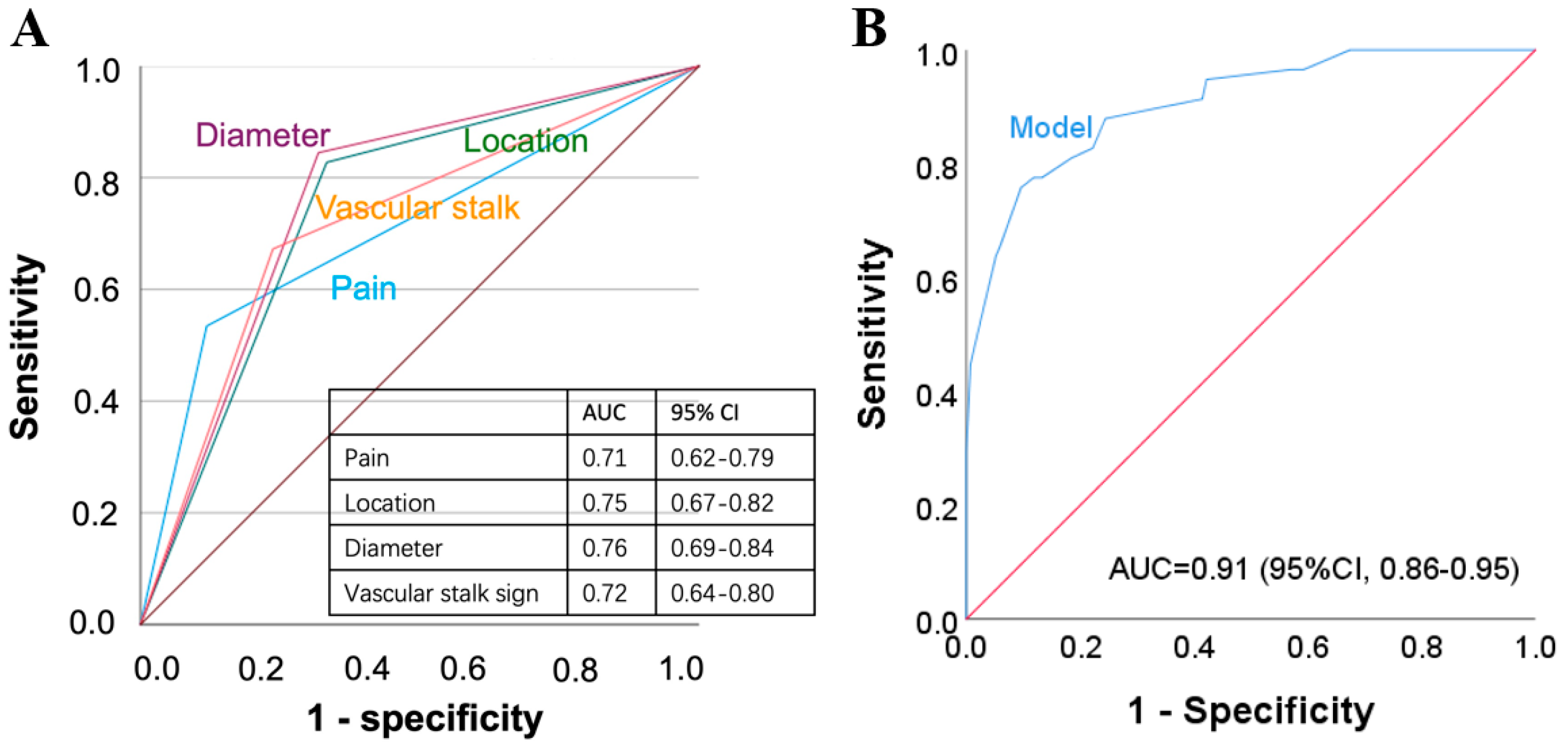 The AUCs of these four factors were 0.71 (pain), 0.75 (location in upper extremity), 0.76 (diameter < 10 mm), and 0.72 (presence of vascular stalk sign). Since in clinical practice, no diagnosis can be made through single feature, a combination of useful clinical and ultrasonographic features via a binary logistic model provided better diagnostic accuracy, with an AUC reaching 0.91. The sensitivity, specificity, and accuracy were 75.86%, 90.37%, and 86.01%, respectively.