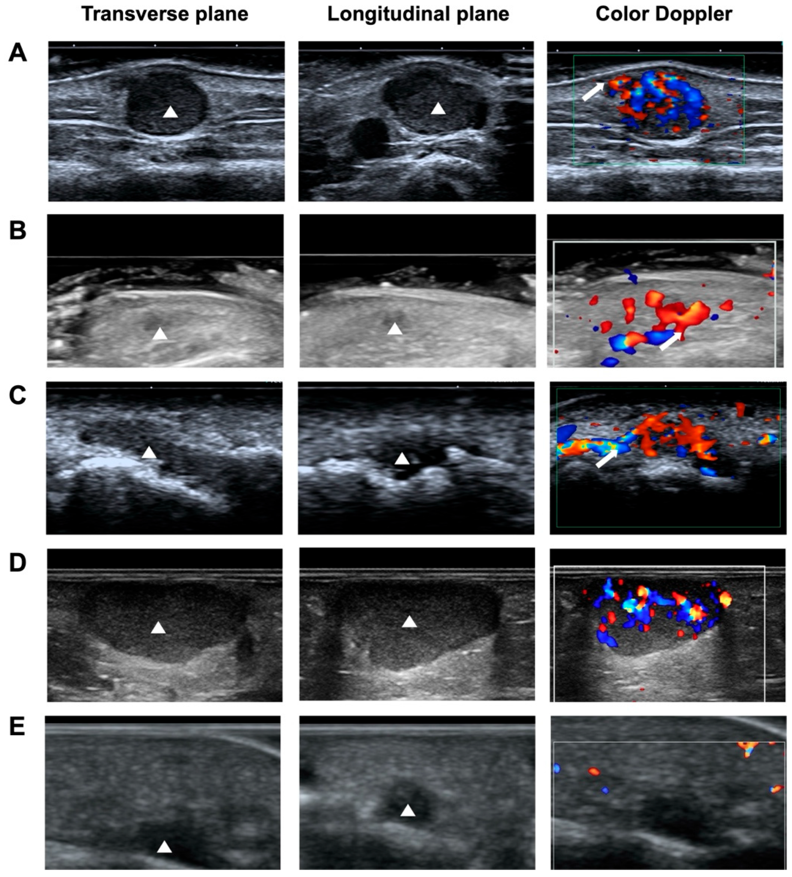 All images were retrospectively retrieved from a database through a consensus of two highly trained musculoskeletal sonographers, with 12 and 10 years of experience, respectively. All lesions were examined using high-frequency transducers with a frequency of 13 MHz or higher. Gray-scale images were obtained in both transverse and longitudinal orientations. Color Doppler settings were optimized to maximize sensitivity to low-velocity flow, including a velocity scale of 1.8–7 cm/s, low wall filter, and optimized Doppler gain adjusted just below the noise threshold.