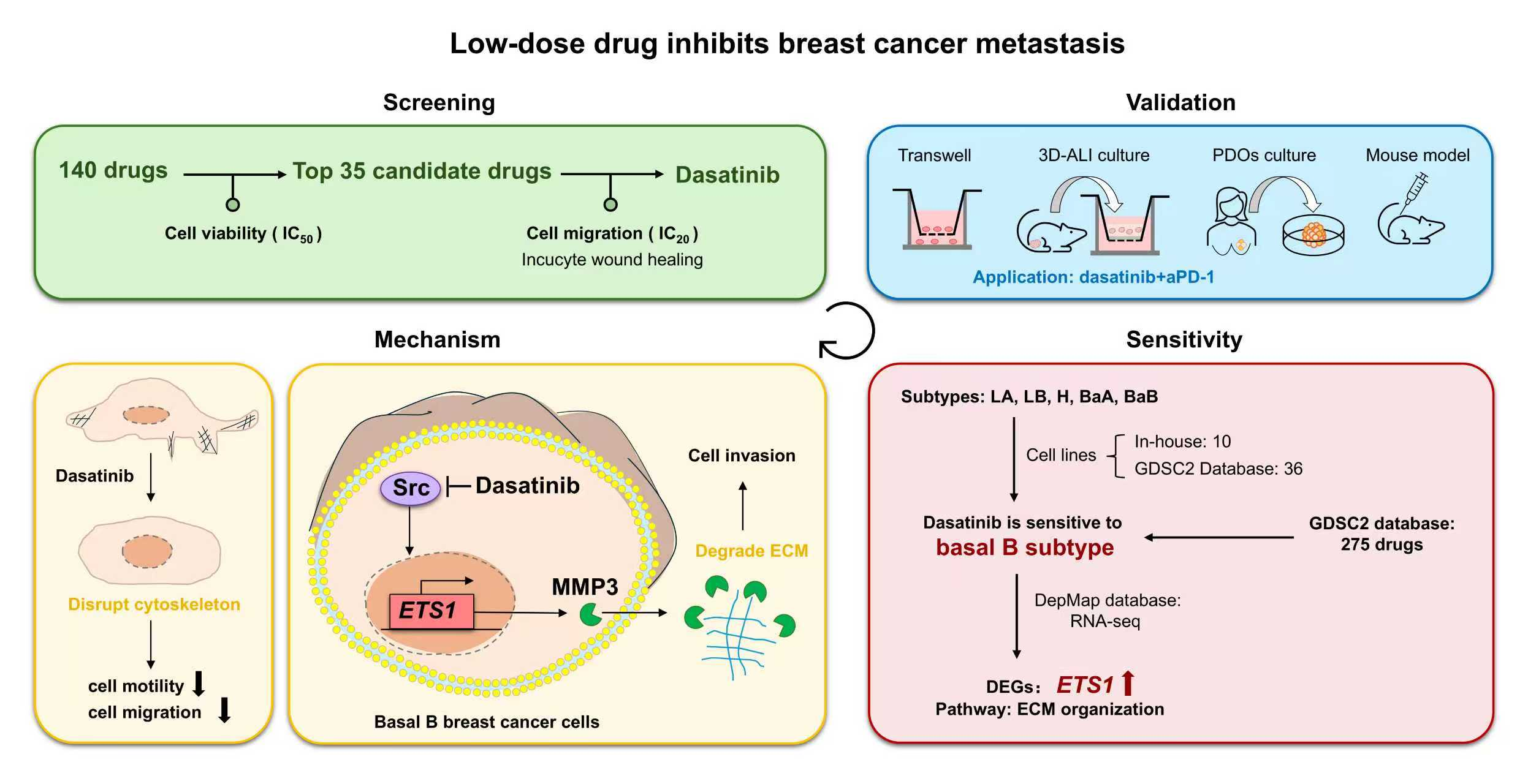 Our previous study showed that low-dose cisplatin inhibits breast cancer metastasis via cytoskeletal remodeling with minimal side effects [19]. Based on these results, we hypothesized that other pharmaceutical agents might display similar activities. Hence, we conducted a systematic screening of our in-house library of 140 compounds to identify potential candidates for drug repurposing in the treatment of breast cancer metastasis. Our research identified dasatinib as a promising drug against metastasis. It functions by disrupting the actin cytoskeleton and impeding filopodia formation, thereby impairing cell motility and migration. Additionally, dasatinib downregulates the ETS proto-oncogene 1 (ETS1) and matrix metalloproteinase 3 (MMP3), leading to ECM remodeling and inhibition of metastasis. This work addresses a critical paradox in dasatinib translation, where clinical trials did not demonstrate benefits in unselected breast cancer patients despite robust preclinical efficacy. By selecting TNBC patients with high ETS1 expression, the therapeutic response to dasatinib may be enhanced, potentially transforming it into a precision oncology tool for aggressive TNBC. Furthermore, combining dasatinib with anti-programmed cell death protein-1 (PD-1) antibodies may offer a potent strategy for metastatic breast cancer treatment.